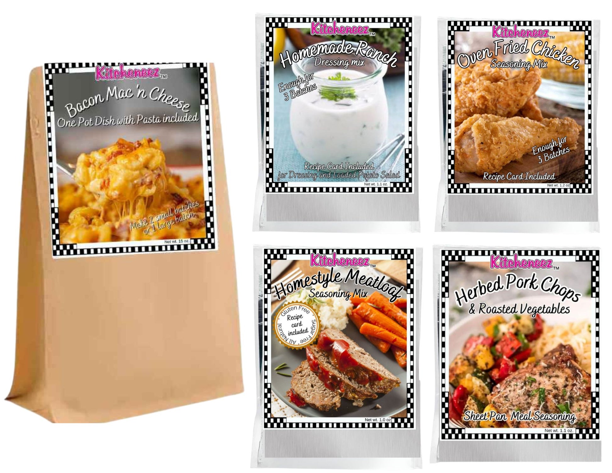 What a delicious bundle! It includes our seasoning mixes for: Homemade Ranch Dressing, Oven Fried Chicken, Homestyle Meatloaf, Herbed Pork Chop Sheet Pan Seasoning and Bacon Mac 'n Cheese One Pot Meal kit.